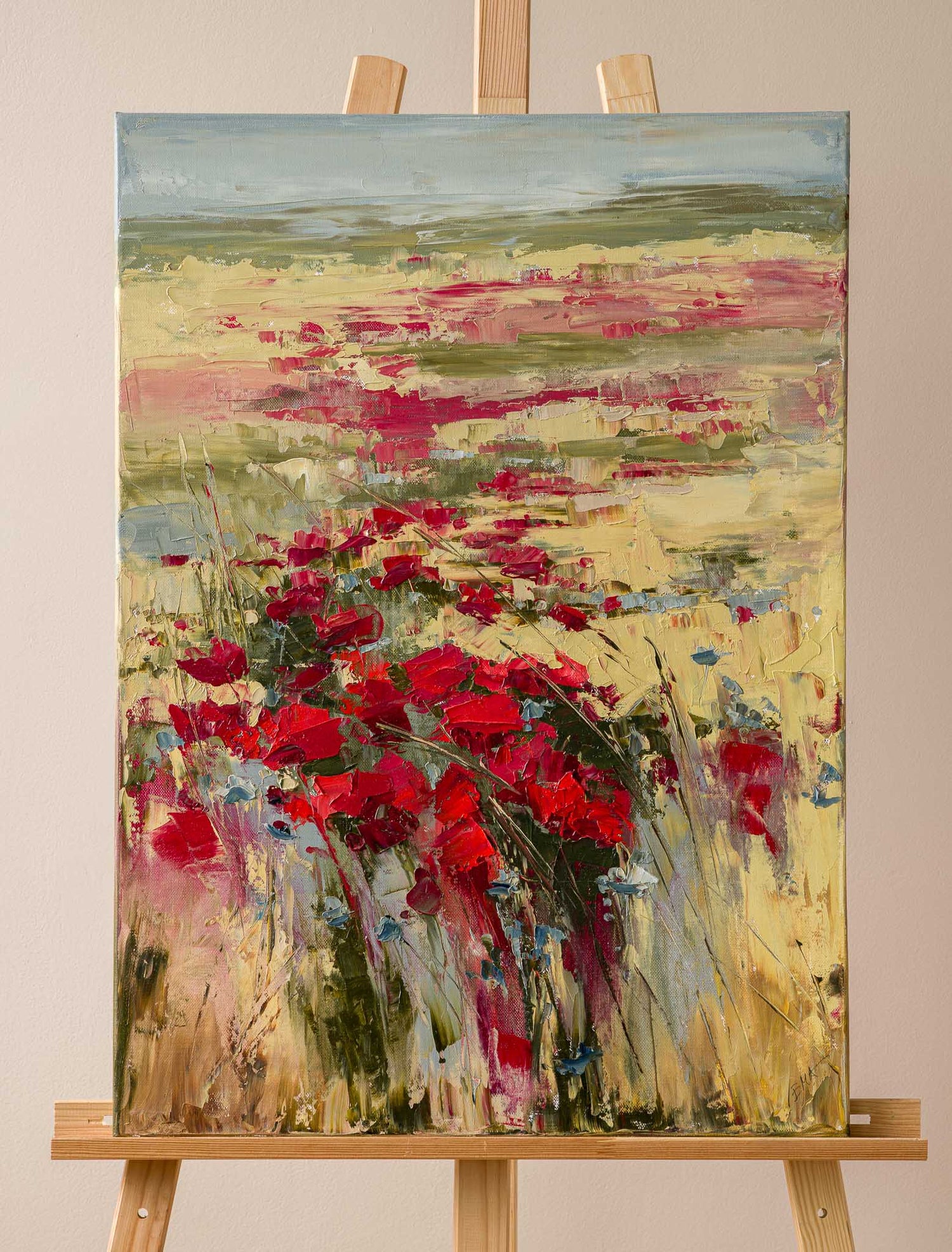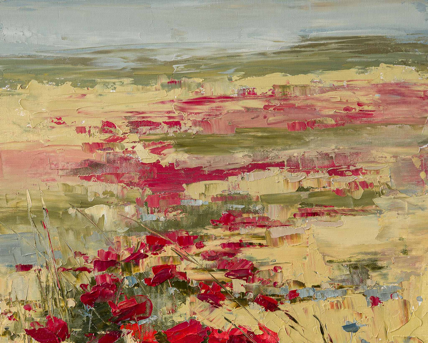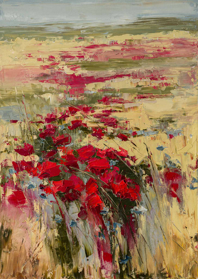 Пейзаж, в който ярките червени макове оживяват златистото поле и създават силен цветен акцент в композицията. Контрастът между топлите тонове и спокойния хоризонт носи усещане за жизненост и отворено пространство.