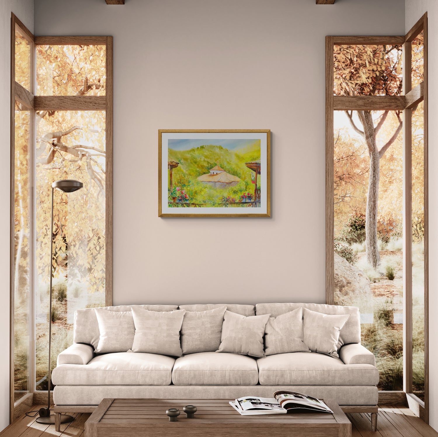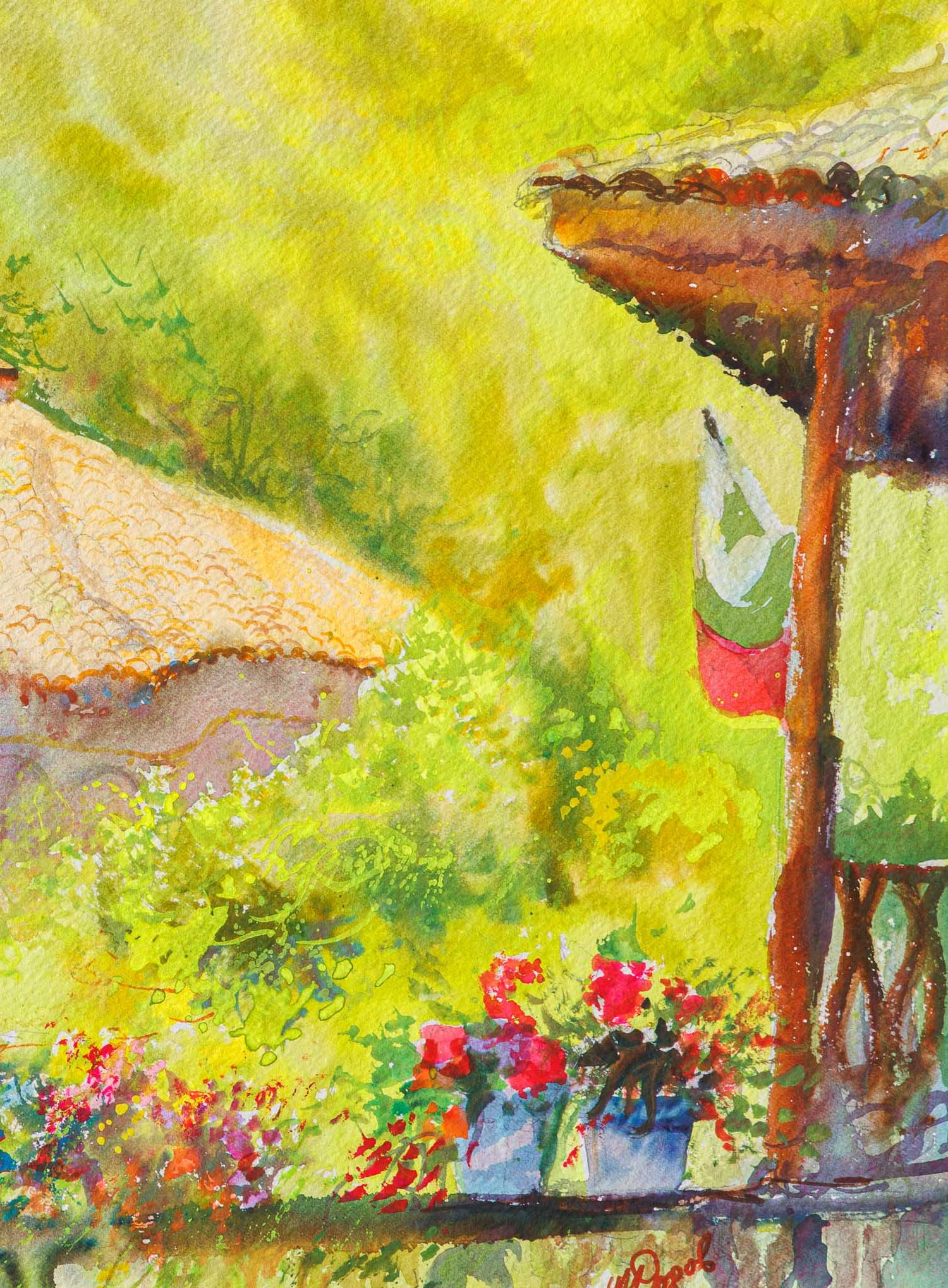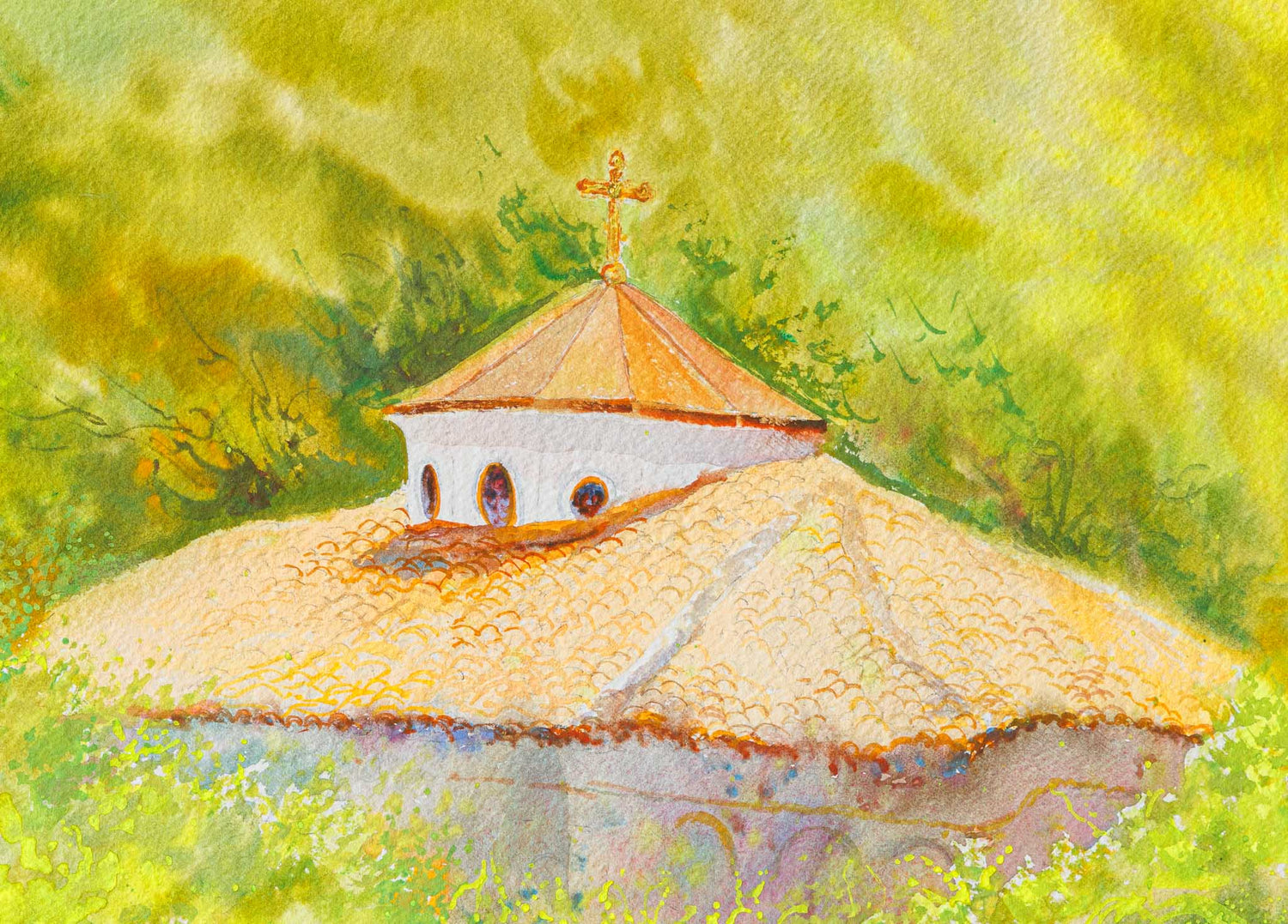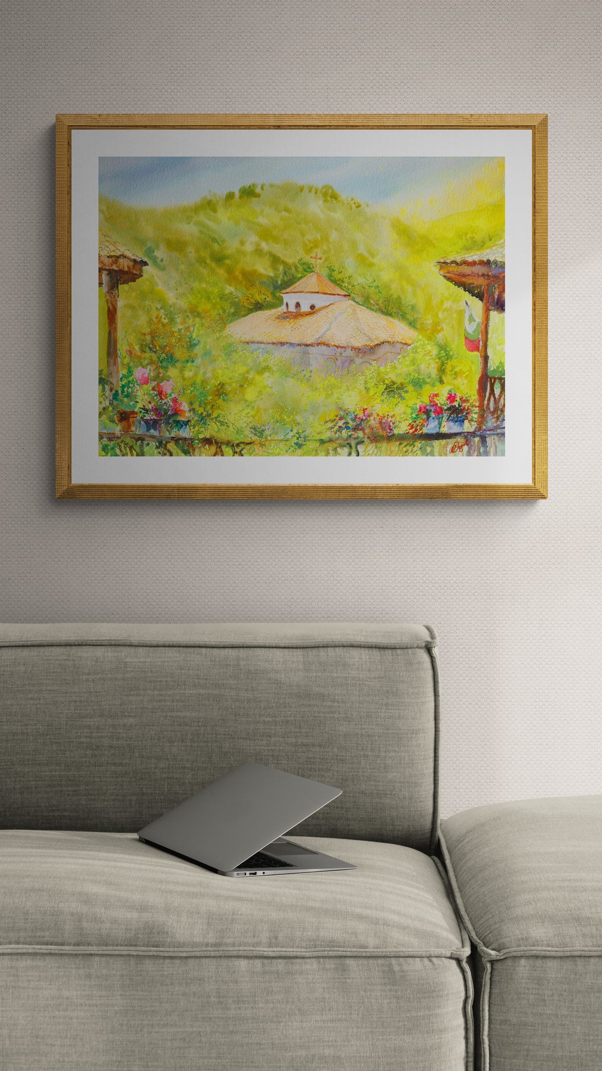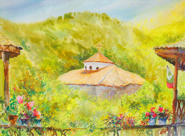 Като кадър от отминал сън – тази сцена носи тишината на ранно утро сред хълмовете. Природата се е събудила с меките зелени тонове, а манастирът сякаш още пази молитвите от нощта. Погледът преминава през цветята на верандата, улавяйки интимността на момента – топла, българска, неподправена.