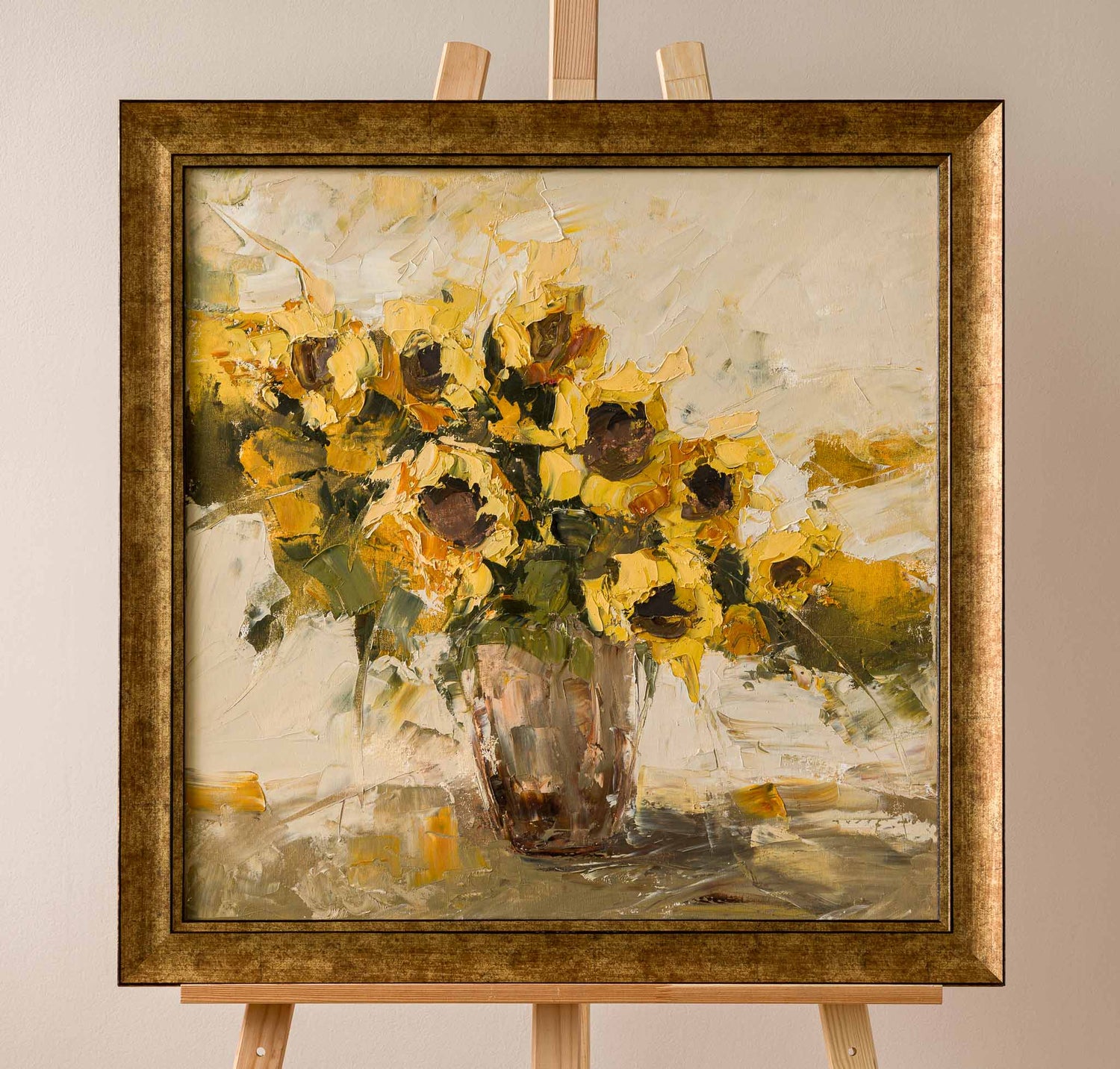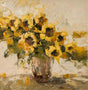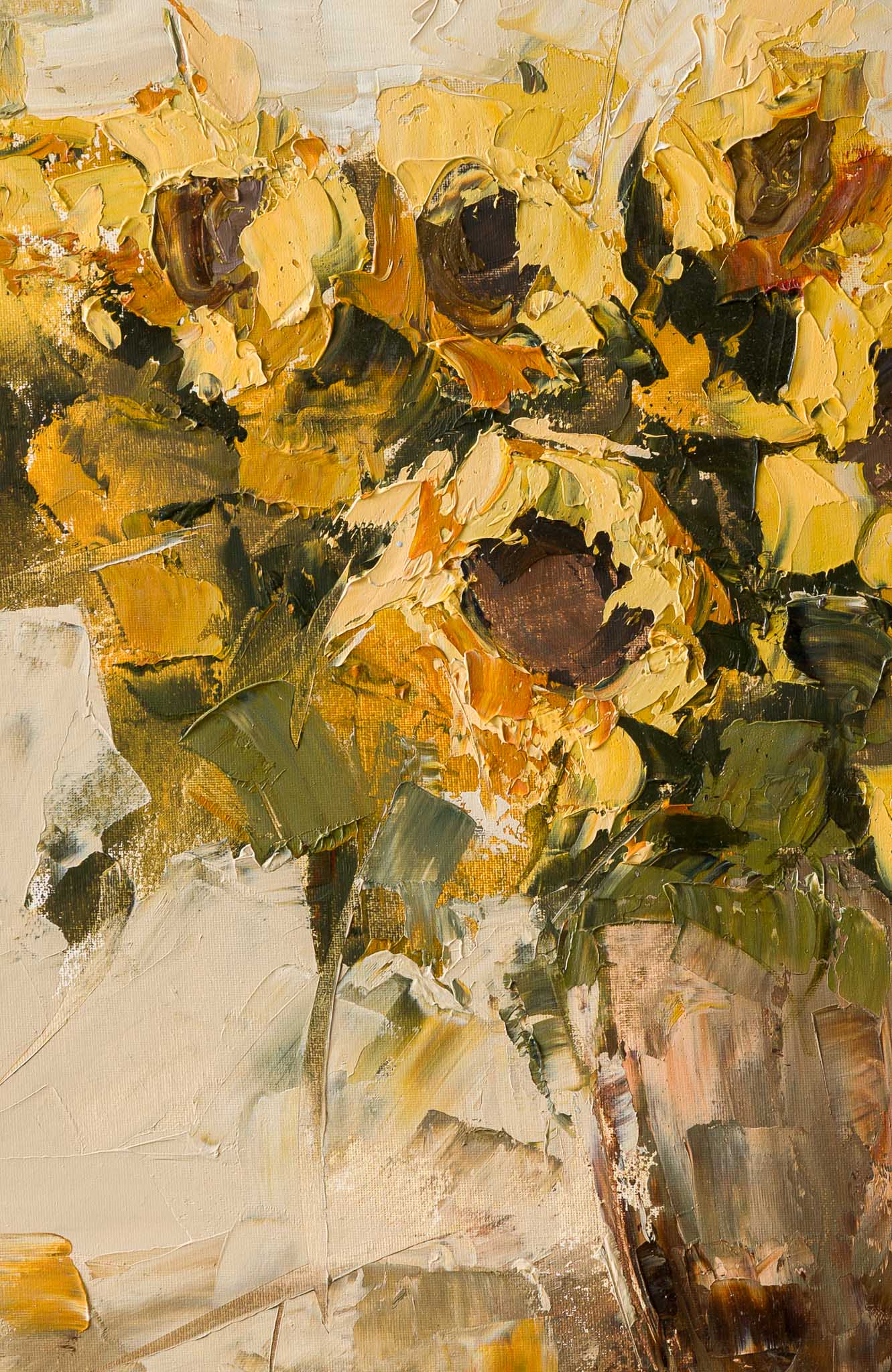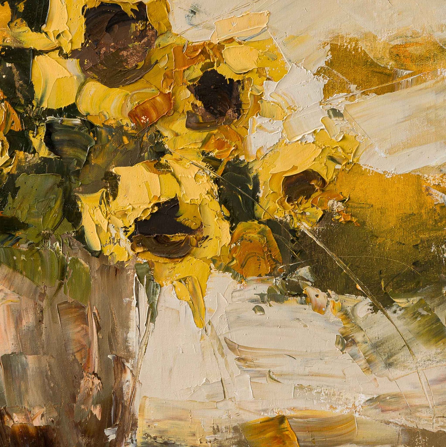 Натюрморт със слънчогледи, изграден с енергичен живописен жест и наситени жълти тонове, които носят усещане за светлина и жизненост. Композицията съчетава плътността на цветовете с по-светъл фон, което подчертава естествената сила и топлина на цветята.