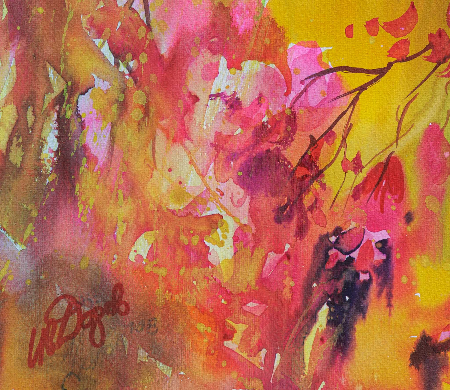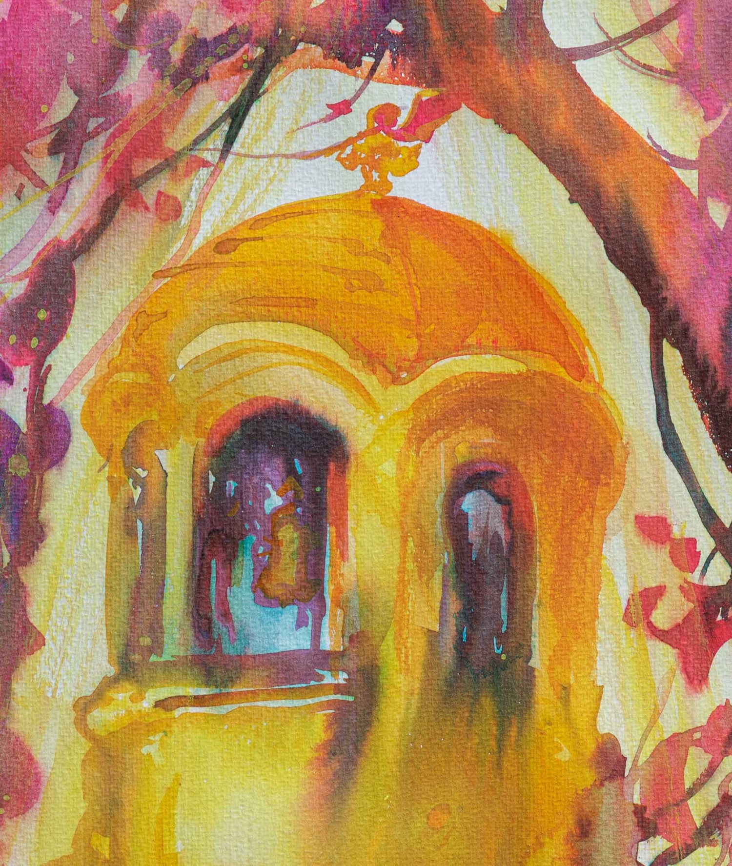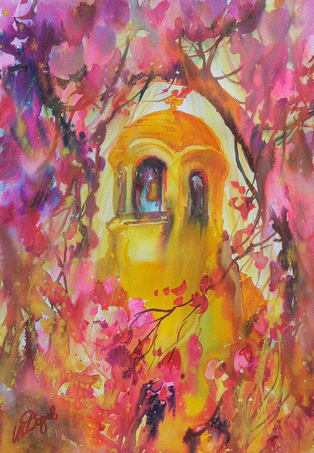 Златистата архитектурна форма се издига като тих символ сред вихъра от розови и пурпурни цветове. Дърветата и светлината се преплитат в полупрозрачни пластове, които обгръщат сградата и я превръщат в почти видение. Композицията носи усещане за духовност и вътрешно спокойствие.