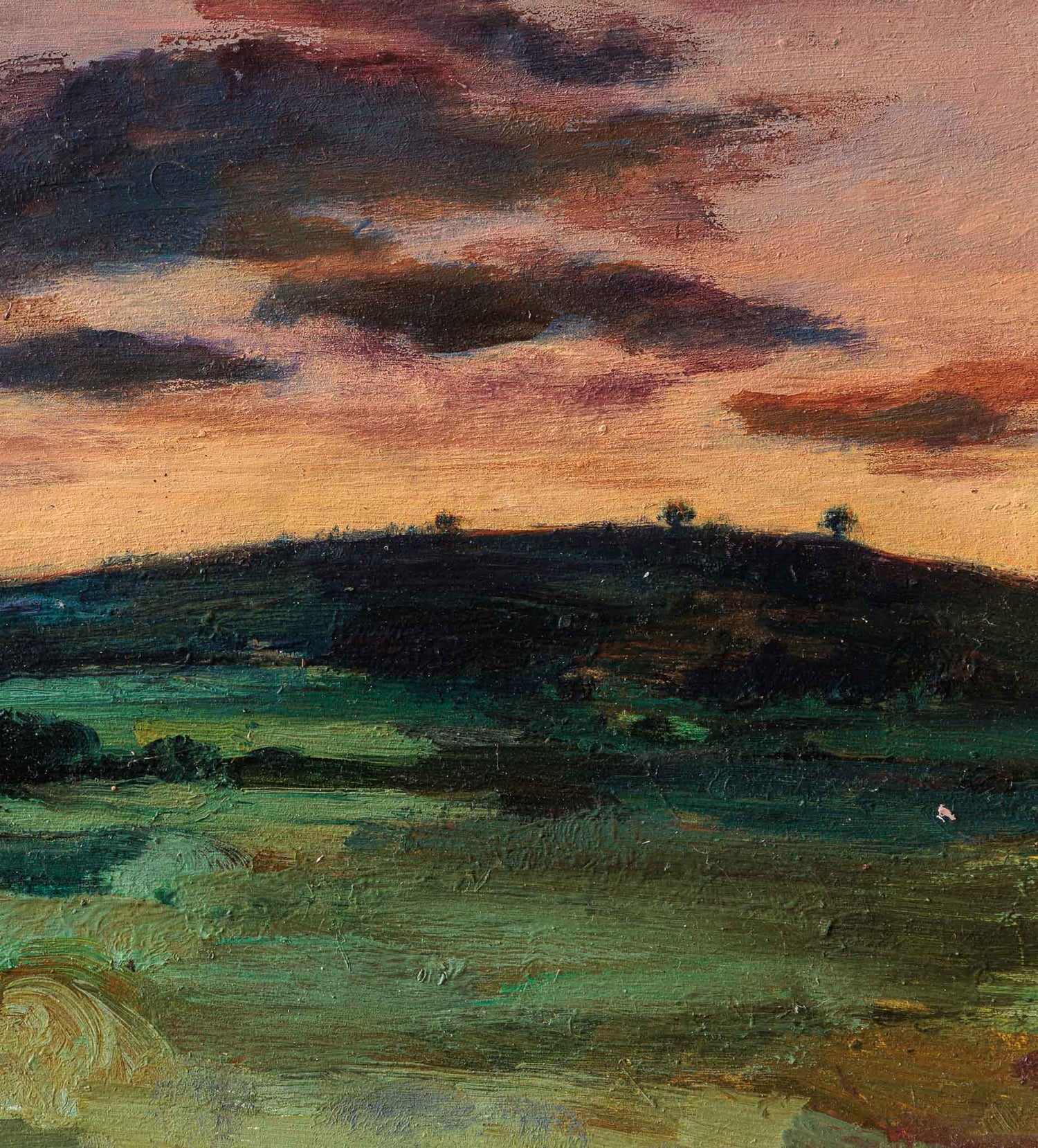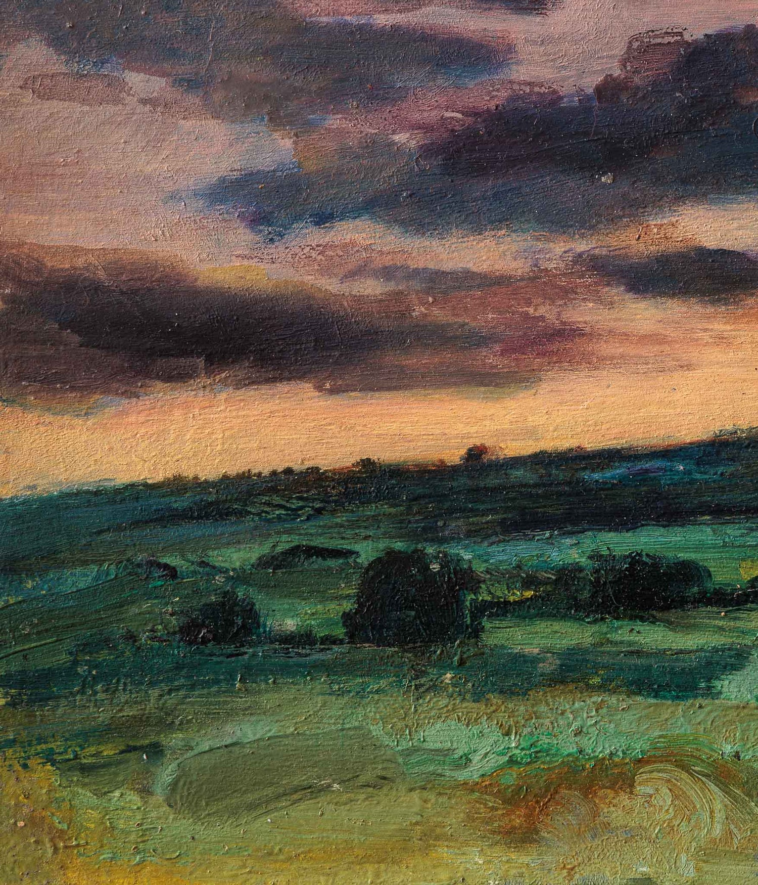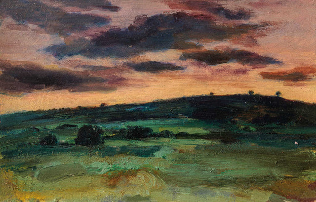 Мек вечерен пейзаж, в който небето и земята се срещат в топли, приглушени тонове. Тежките облаци балансират светлината на залеза, а плавните мазки в зеленото поле създават усещане за дълбочина, тишина и спокойно отминаване на деня.