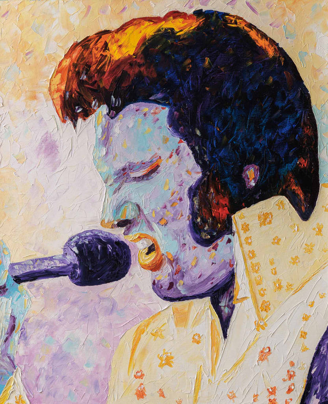 Експресивен портрет, в който силата на образа е предадена чрез плътна фактура и наситени цветове. Контрастът между светлина и сянка подчертава харизмата и сценичното присъствие на иконата, превръщайки портрета в емоционален жест, а не в буквален образ.