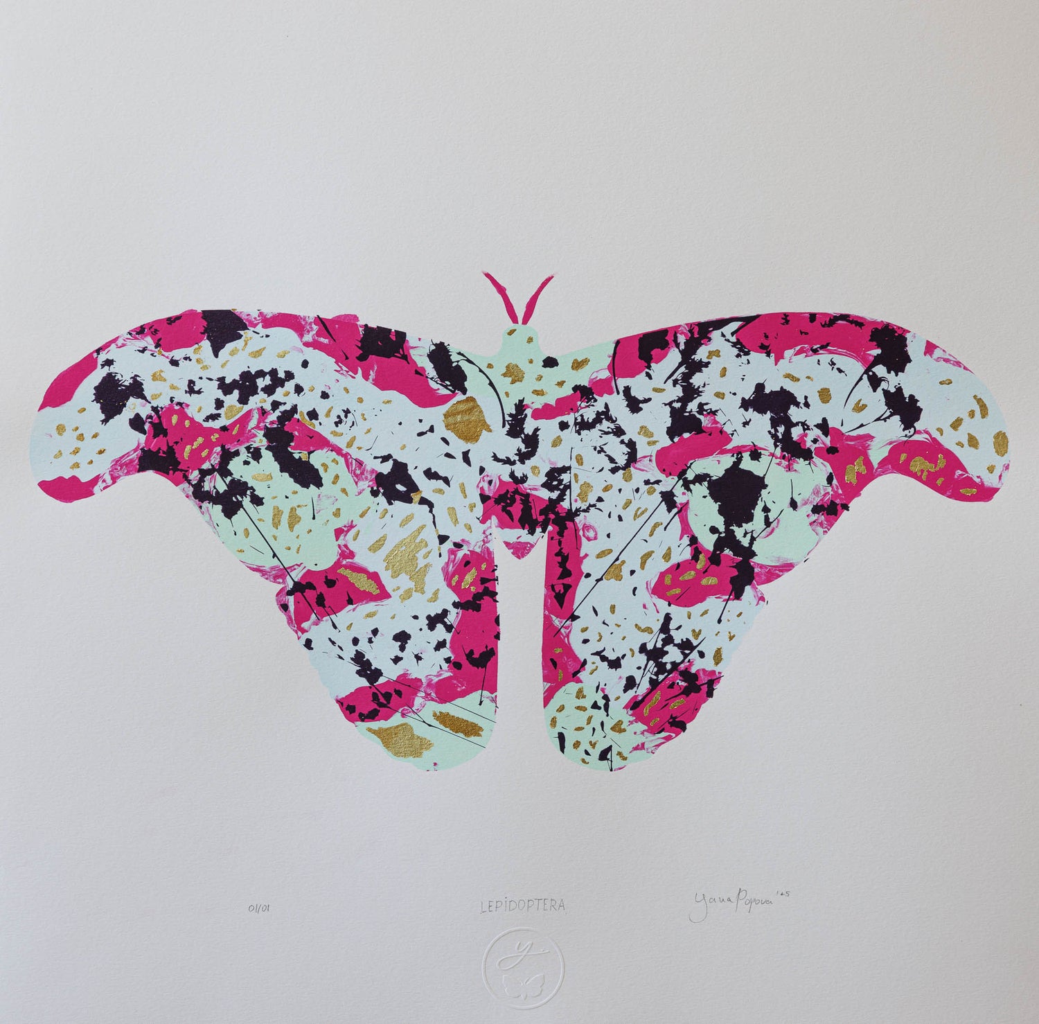Lepidoptera е личен разказ за крехкостта и преходността на живота. Вдъхновена от нощните пеперуди – символи на промяна и трансформация – Яна Попова създава серия от уникални монопринтове, всеки като един-единствен дъх, миг и отпечатък от живот.