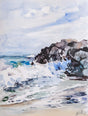 Миг преди вълната да се разбие – акварелът улавя силата на водата и контраста ѝ със статичността на скалите. Свободният жест и пестеливите детайли подчертават живата енергия на морето. Картина, наситена с ритъм, свежест и естествен драматизъм.