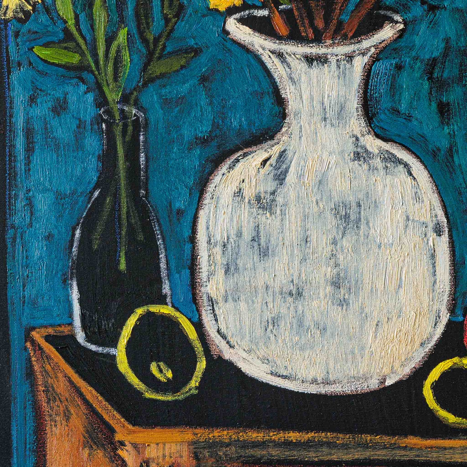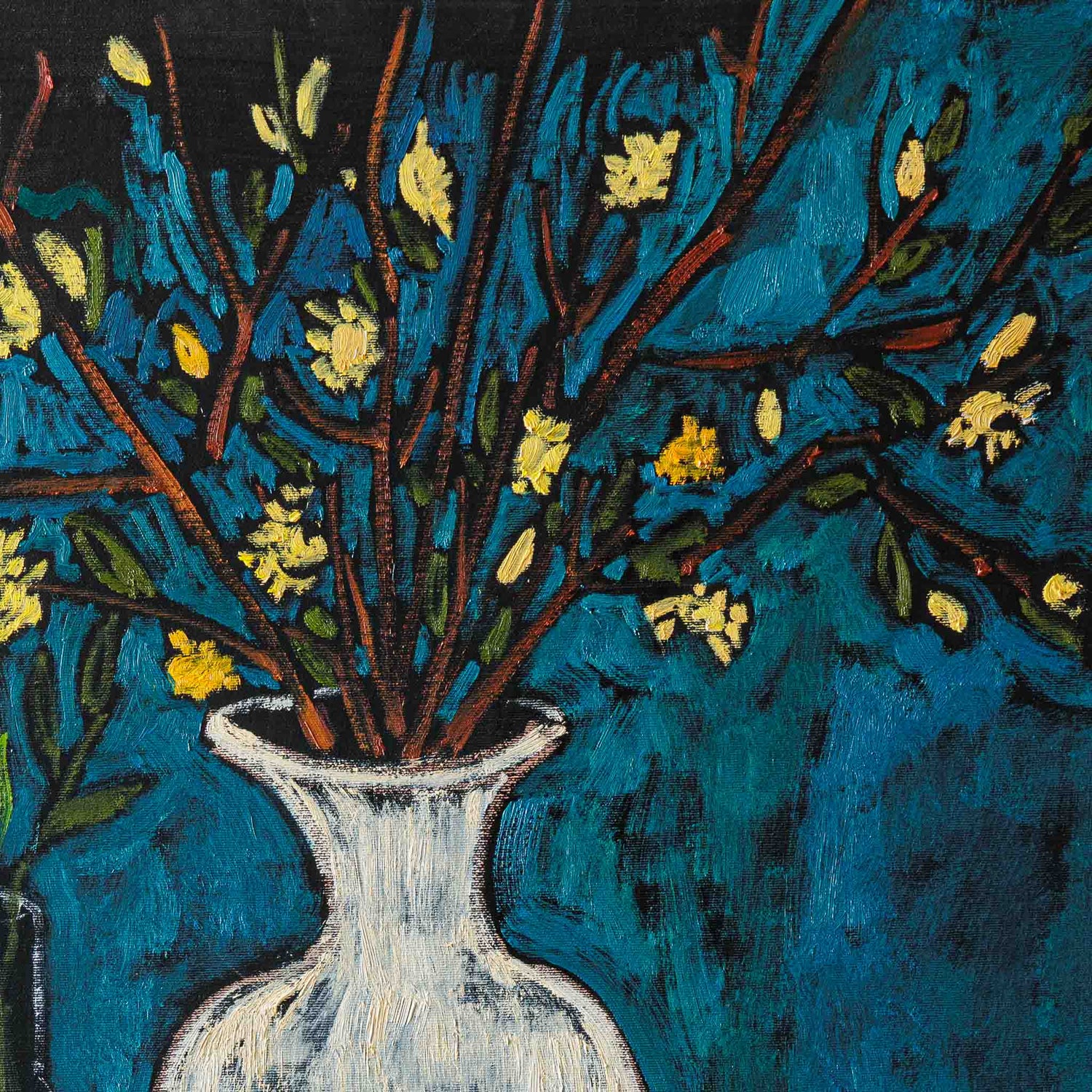 Клонките с нежни пролетни цветове се разгръщат като тихо пробуждане върху наситения син фон. Белезникавата ваза отразява светлината като застинал отблясък, а малките плодове до нея внасят земна хармония. Топлият дървен шкаф контрастира с хладните тонове и придава усещане за дом, в който въздухът вече носи първия повей на сезонна промяна.